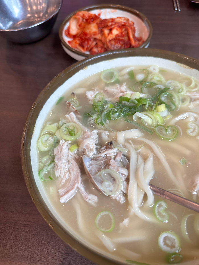 드디어 국물을 한 숟가락 맛보는 순간, 40분의 기다림이 눈 녹듯 사라졌습니다. 이건 그냥 닭칼국수가 아니에요! 닭 한 마리를 푹 고아 낸 듯한 녹진하고 진한 육수에 바지락에서 우러나온 시원한 감칠맛이 더해져 정말이지 입안에서 맛의 향연이 펼쳐집니다. 흔히 '닭한마리'를 먹고 마지막에 끓여 먹는 그 칼국수의 가장 맛있는 버전이라고 할까요? 딱 그 맛입니다!! 큼지막하고 부드러운 닭고기 살도 푸짐하게 들어있어 씹는 맛을 더해줬어요.